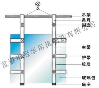 1.使用時將玻璃吊帶的吊耳套進吊架橫梁的兩端,固定在與玻璃包相等的位置。